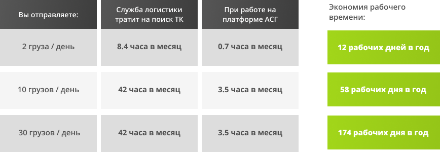 АСГ – это уникальная платформа, позволяющая сравнить условия перевозки сборных грузов ведущих транспортных компаний. Платформа выдает предложения транспортных компаний в режиме реального времени - с учетом актуальных цен и сроков доставки. Это дает возможность пользователю сравнить условия разных грузоперевозчиков, выбрать оптимальный вариант по нужному направлению, оформить заявку и самостоятельно управлять ими через личный кабинет.